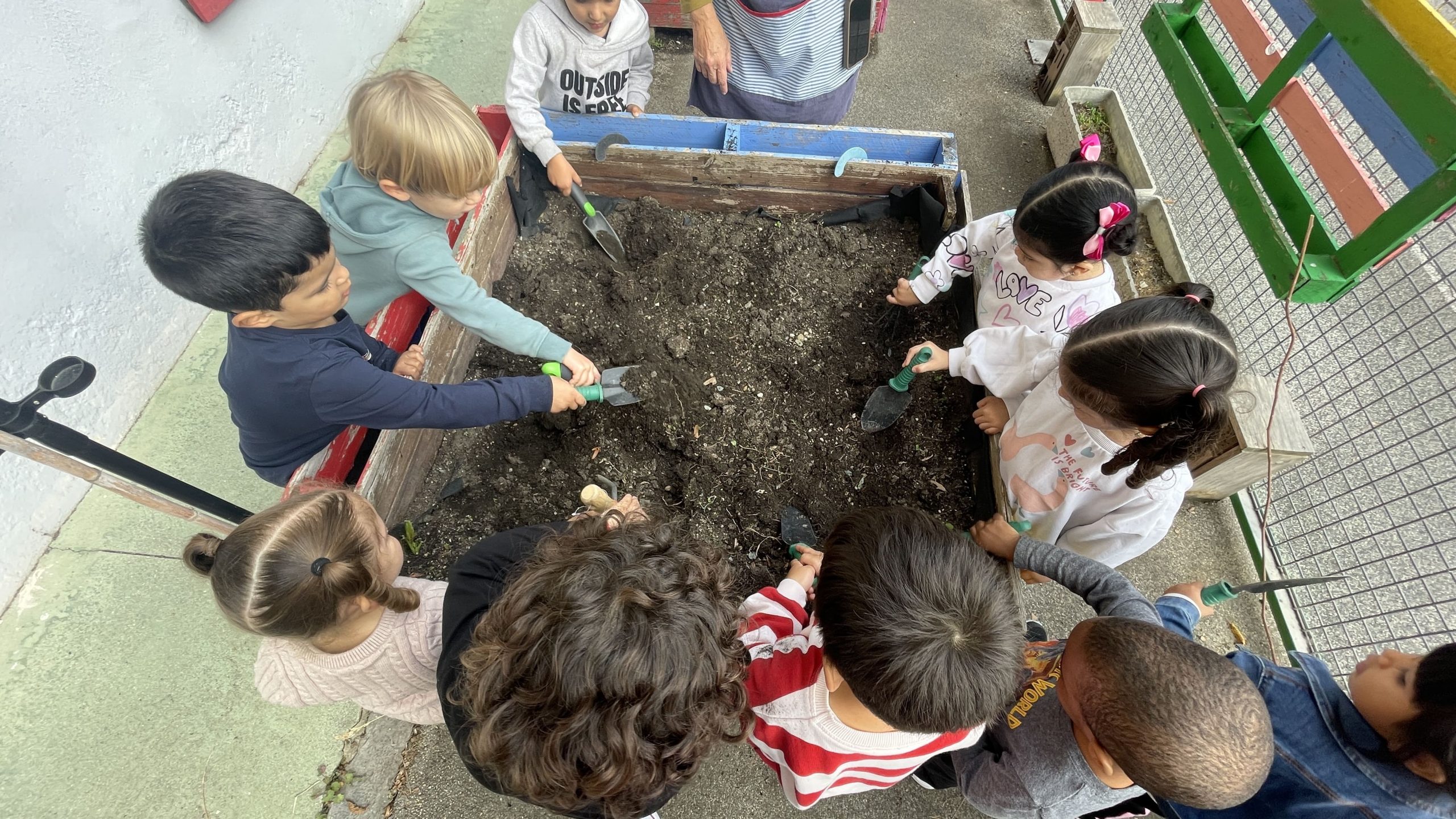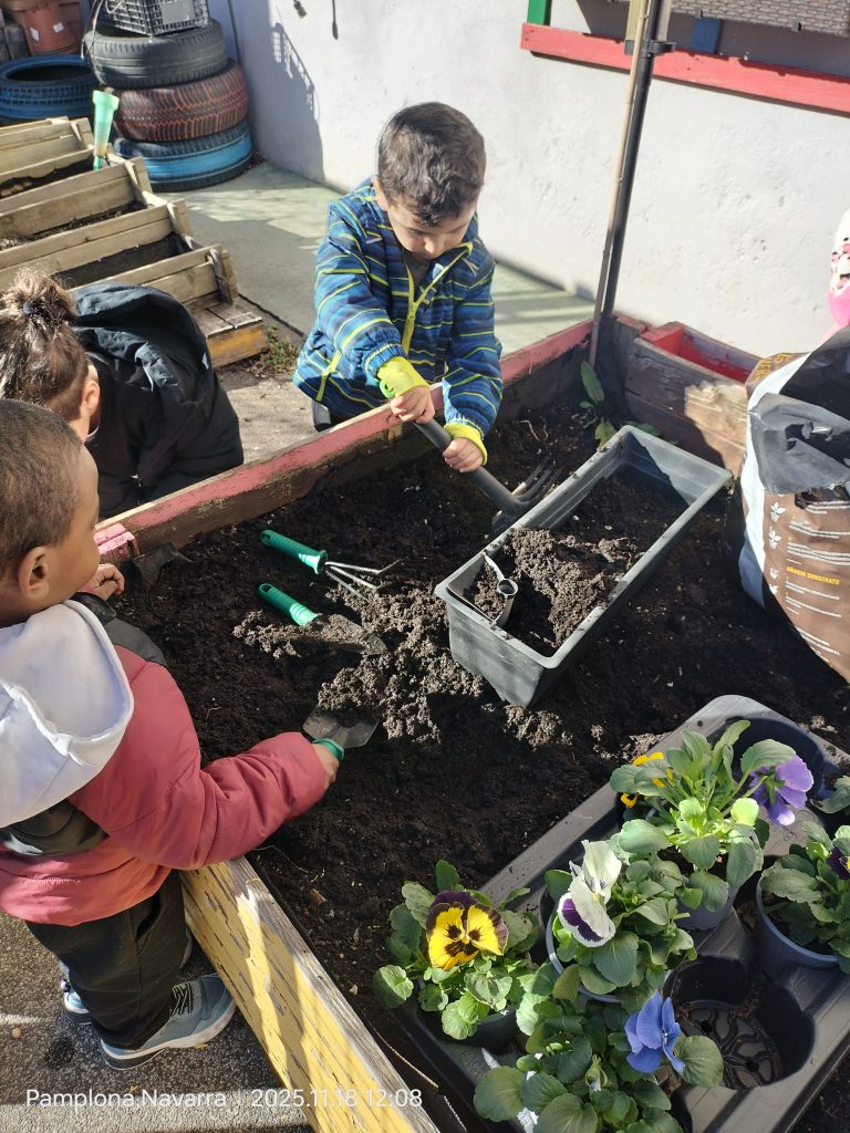 A los chicos y chicas de 3 años nos gusta ir al huerto de nuestro cole. Hemos disfrutado preparando la tierra de los bancales con ayuda de rastrillos y palas para que nuestros compañeros de primaria puedan plantar lechugas y otras sorpresas. Nosotros hemos plantado pensamientos de colores y han quedado así de preciosos.